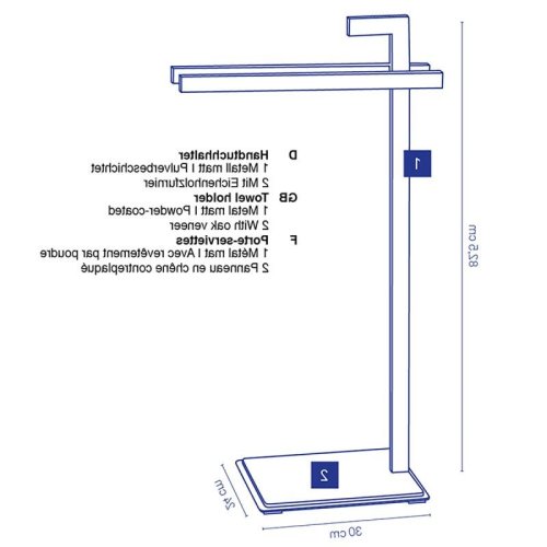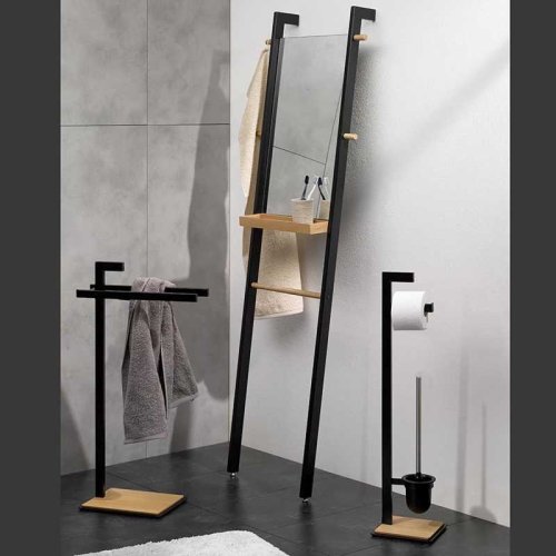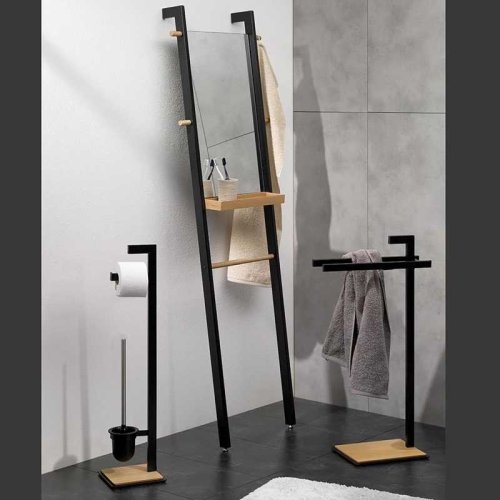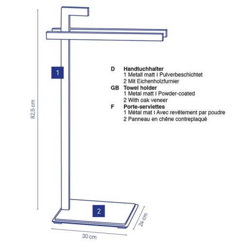 Stylový a moderní vzhled: dubový věšák na ručníky vyrobený z kovu. Stojící model získává svůj osobitý vzhled kombinací černého povrchu, plochých tvarů a světle hnědé dubové dřevěné dýhy na základní desce. Držák ručníku má 2 neotočné držáky na ručníky. Základní deska držáku na ručník má rozměry 30 x 24 cm s celkovou výškou 82,5 cm. Kov černý matný s dubovou dřevěnou dýhou 30x24cm 82,5cm v