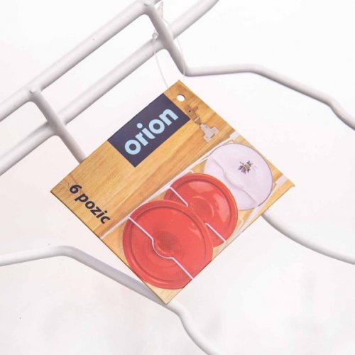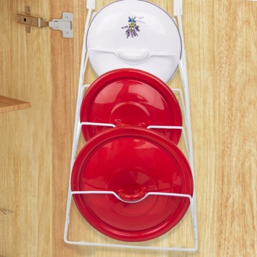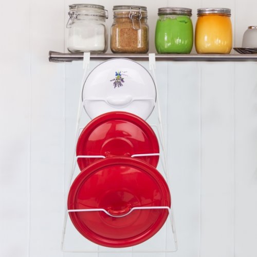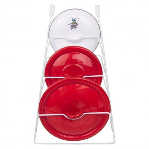 Stojan na poklice uloží do kuchyňské skříňky přehledně až 6 poklic různé velikosti (cca od velikosti 14 cm do cca 28 cm). Nemusíte ho složitě připevňovat, stačí ho pověsit na dvířka skříňky. Materiál drát s povrchovou plastovou úpravou. Rozměry š. 27.5 cm, v. 47 cm, na max. tl. dvířek 2.5 cm. EAN 8592381162559
