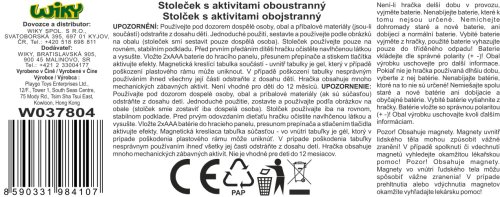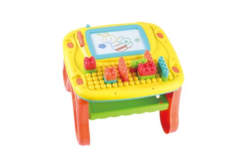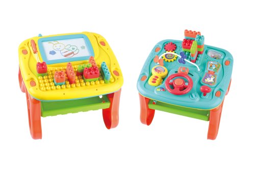 Stoleček s aktivitami oboustranný. Velikost 37cm. Na vrchní straně stolku je volant, řadicí páka, chrastítka a jiné aktivity. Spodní strana obsahuje kreslicí magnetickou tabulku a podložku pro stavění kostek. Kotky součástí. Hraje melodie. Baterie součástí.