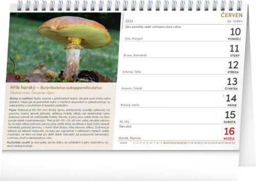 Houbařský kalendář je ideální pro všechny nadšené houbaře. Najdete v něm známé i méně známé druhy hřibovitých hub, popis jejich biotopu, kuchyňské využití a vliv na zdraví. Texty a fotografie připravil odborník a mykolog Jaroslav Malý. Stolní kalendář s českým kalendáriem obsahuje svátky a památné dny, měsíční fáze a přehled na celý rok.