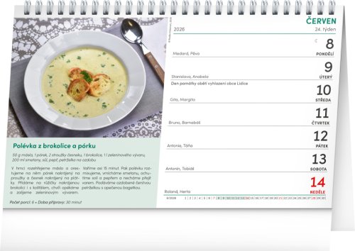 53 receptů na ty nejlahodnější polévky. Ochutnejte každý týden jinou! Týdenní kalendárium s prostorem pro poznámky obsahuje také svátky, památné dny, měsíční fáze a přehled na celý rok 2026 a 2027.