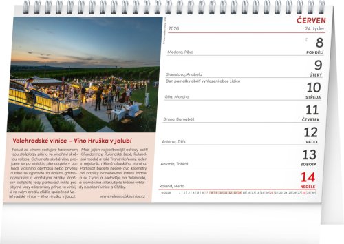 Stolní kalendář pro všechny milovníky vína. Navštivte spolu s námi místa, kde se víno dobře pěstuje, ale i popíjí. Tento kalendář může posloužit i jako neocenitelná inspirace pro vaše výlety za vínem, při kterých se pojí poznávání krás naší vlasti a zajímavých vinařských destinací. Obsahuje také svátky, památné dny, měsíční fáze a přehled na celý rok 2026 a 2027.
