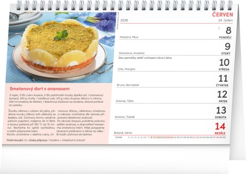 Kalendář s recepty na zákusky, moučníky i "sladké tečky". Každý recept je doplněn fotografií výsledného pokrmu. Týdenní kalendárium s prostorem pro poznámky obsahuje také svátky, památné dny, měsíční fáze a přehled na celý rok 2026 a 2027.