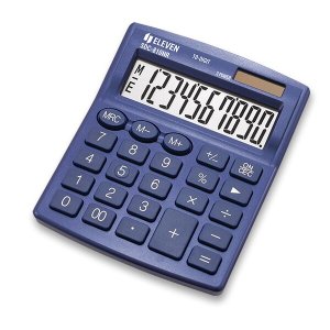 Kompaktní stolní kalkulátor se základními funkcemi a mírně nakloněným displejem.