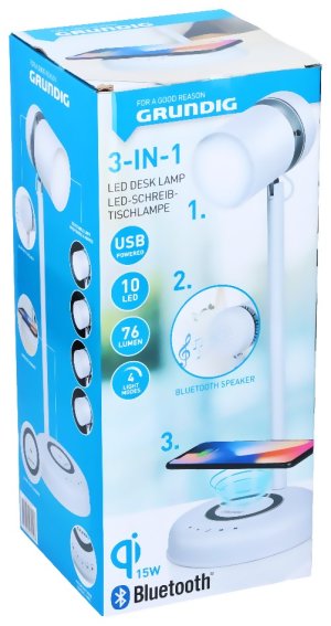 Tato stolní lampa vám nabízí více než jen světlo při čtení nebo práci. S touto multifunkční stolní lampou od Grundig můžete také nabíjet svůj mobilní telefon a poslouchat hudbu přes připojení Bluetooth verze 5, které vydrží až 10 metrů. Teplota LED je 4000k a na základně lampy je ovládací panel, který umožňuje ovládat lampu.Přehrávání hudbyZadní strana stolní lampy je vybavena reproduktorem, díky kterému je stolní lampa multifunkční! Mobilní telefon můžete připojit přes Bluetooth, stejně jako hudební box. Vyberte si svůj oblíbený seznam skladeb a užívejte si hudbu, zatímco je váš stůl nebo noční stolek osvětlený.Funkce nabíjeníDochází vašemu telefonu energie? Pak použijte lampu jako bezdrátovou nabíjecí stanici pro váš mobilní telefon! Plošina, na které je lampa umístěna, je zároveň powerbankou s technologií Qi. Pokud na toto plato položíte telefon, který podporuje technologii Qi, bude se nabíjet. Samotné světlo lze nabíjet přiloženým kabelem. Výstup je jak USB-A, tak USB-C.Specifikace Stolní lampa LED 3 v 1 bíláLED osvětlení: 76 lumenůUSB-C vstup