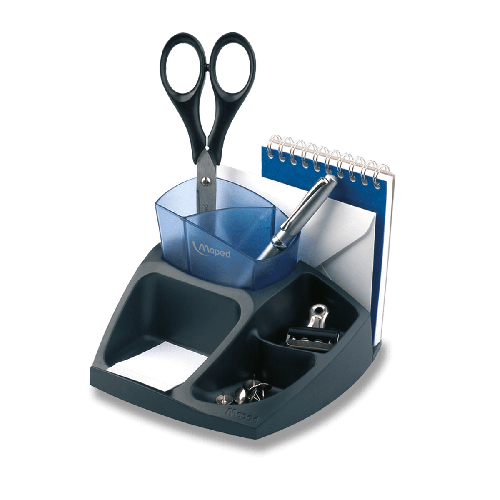 Stolní organizér s odnímatelným stojánkem na psací potřeby. Samostatné přihrádky na samolepicí bloček, dopisy a kancelářské drobnosti. Dodáváno bez obsahu. Rozměr (š x d x v): 145 x 138 x 92 mm