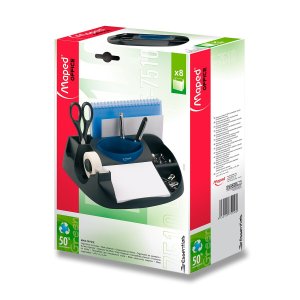 Stolní organizér se zásobníkem na lepicí pásku (19 mm x 33 m), s držákem na dopisy a dalšími přihrádkami na kancelářské potřeby. Dodáváno bez obsahu,Vyrobeno ze 78 % z recyklovaného plastu.