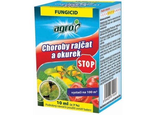 AGRO Choroby rajčat a okurek STOP je postřikový fungicid s protektivním (ochranným) účinkem. Používejte k ochraně proti plísním okurek a rajčat, a také cuket, cibule, hráchu a česneku. Aplikuje postřikem nebo rosením před nebo na počátku infekce (preventivně nebo při zjištění prvních příznaků). Při vyšším tlaku plísní lze postřik po 12ti dnech zopakovat.