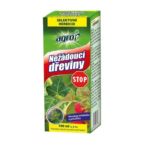 AGRO Nežádoucí dřeviny STOP je účinný systémový selektivní arboricid a herbicid. Používejte k hubení nežádoucích dřevin / polodřevin (maliník, ostružiník, břečťan, škumpa, mahonie, zimostráz, staré růže a vřesy apod.), náletových dřevin (akát, buk, jíva, jeřáb aj.), dvouděložných plevelů v trávníku.