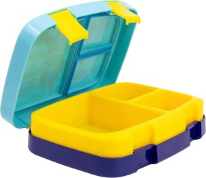 praktická krabička se 4 přihrádkami rozdělenými do 2 úrovní, 3 přihrádky nahoře a 1 přihrádka (podnos) dole, vyrobena z odolného materiálu - vydrží pády a nárazy při každodenním používání, bez BPA.