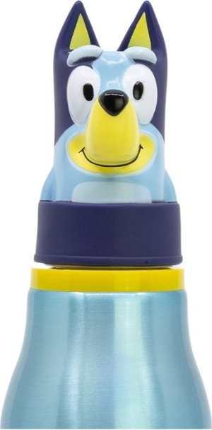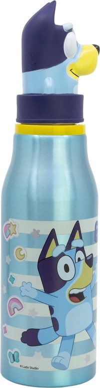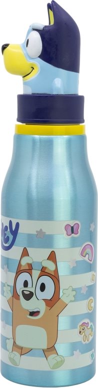 Dětská hliníková láhev na vodu, 690 ml, s figurkou na víčku Bluey. Odolná hliníková láhev se šroubovacím víčkem, zdobená 3D figurkou oblíbené postavičky z dětských seriálů. Děti ji budou chtít mít stále u sebe.