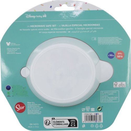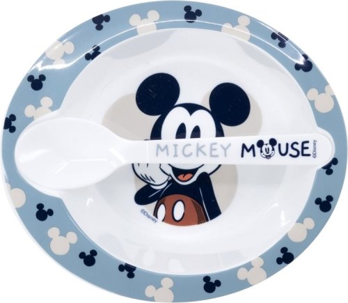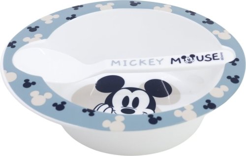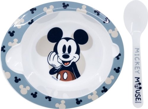 Praktická sada dětského nádobí s motivem Mickeyho Mouse skládající se z misky a lžičky.