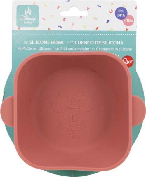 Čtvercová miska s motivem Minnie s přísavkou pro přichycení na stůl je ideální volbou pro první pokusy o krmení.