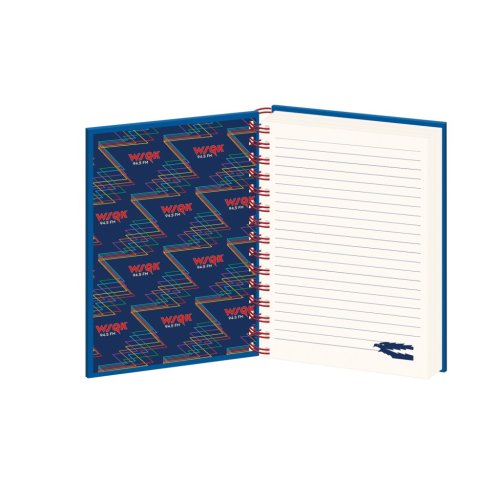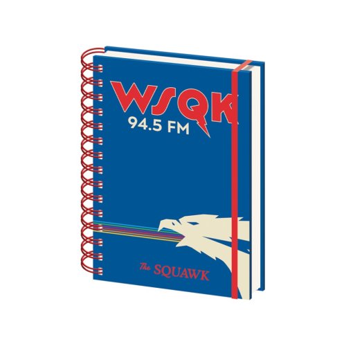 Stranger Things blok kroužkový - WSQK DPL10 je praktický poznámkový blok, který zaujme všechny fanoušky populárního seriálu Stranger Things. Jeho pevná obálka je laděna do tmavě modré barvy a zdobí ji výrazné červené logo WSQK 94.5 FM, což je odkaz na ikonickou rozhlasovou stanici ze seriálu. Na přední straně je také stylizovaný motiv orla, který z obálky vystřeluje barevné linky, což dodává bloku dynamický a atraktivní vzhled. Červená kovová spirála pevně drží stránky pohromadě a zároveň umožňuje snadné otáčení listů.
