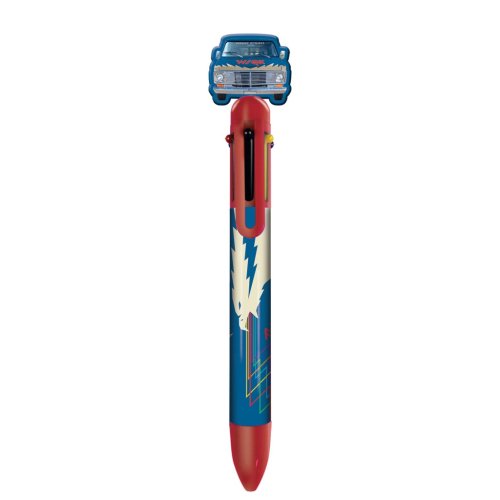 Na vrcholu pera je umístěna plastová dekorace ve tvaru přední části modrého auta, které je výrazným symbolem z prostředí Stranger Things. Tento detail nejenže zvyšuje vizuální atraktivitu, ale také podtrhuje tematickou spojitost produktu. Mechanismus pera umožňuje snadné přepínání mezi šesti barvami pomocí malých posuvných tlačítek v různých barvách umístěných na hlavě pera.