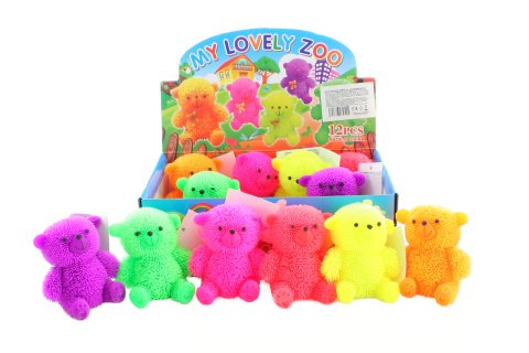 Gumový střapatý medvídek. Uvnitř svítící kulička, která bliká. Rozměry cca 9 x 8 x 5,5 cm. Věk 3+