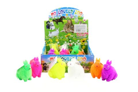Gumový střapatý zajíček. Uvnitř je svítící kulička, která bliká. Rozměry cca 8 x 7 x 5 cm. Věk 3+