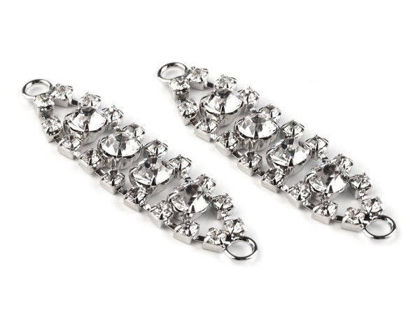 Noblesní štrasovou ozdobu doplňují třpytivé broušené kamínky. Přizpůsobí se jakémukoliv tvaru. Díky dvěma očkům po stranách ji můžete našít na oděvy a doplňky (rukavice, klobouky, látkové čelenky do vlasů apod.). [Dá se použít na ramínka, vynikne také na obuvi.] Ozdoba je vyrobená z nemagnetického kovu, magnetická jsou pouze očka po stranách. Varianta č. 2 má rozměry 12 x 55 mm.