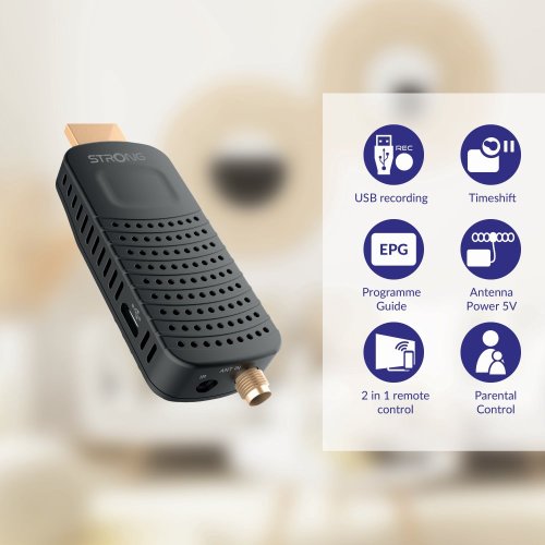 TV tuner pro upgrade vašeho televizoru s vestavěným DVB-T tunerem na nové vysílání DVB-T2 s kodekem H.265. Zařízení stačí připojit k televizoru skrze HDMI konektor a díky malým rozměrům jej tak i snadno schovat. Ovládání je pak snadné díky přiloženému 2 v 1 dálkovému ovladači, který umožňuje ovládat TV tuner i televizor. Zařízení nabízí paměťovou kapacitu až 400 kanálů, 8 seznamů oblíbených kanálů nebo dokonce až 8 časovačů událostí se 3 režimy (jednorázový, denní, týdenní). Potěší také elektronický průvodce programy (EPG) či možnost nahrávání pořadů na externí USB úložiště. Výhodou zařízení je také napájení z USB televizoru, neobsazuje tak další zástrčku.