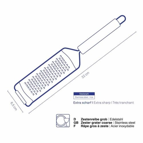 Speciální struhadlo na kůru citrusových plodů: struhadlo na hrubou kůru Rondo je ideální pro strouhání jemných proužků kůry z citronů, limetek nebo pomerančů, tzv. kůry. Úzký tvar usnadňuje cílené setírání skořápek. Hrubé nerezové struhadlo na kůru je 6,5 cm široké a 32 cm dlouhé. Hrubý 4mm, nerez, 32x6,5cm
