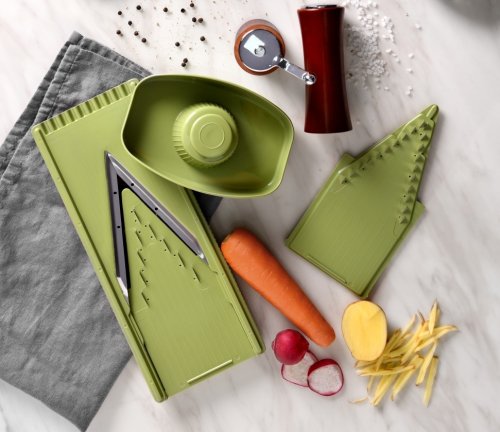 4PC MULTI SLICER SET - PLASTIC- 2PCS REMOVABLE BLADE - 1PC SAFETY HOLDER - 1PC PLASTIC SLICING BOARD - OLIVE