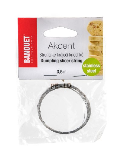 Nerezová struna ke kráječi knedlíků AKCENT. Pokud máte v kráječi na knedlíky poškozenou nebo opotřebovanou strunu, doporučujeme ji vyměnit za novou. Tato náhradní struna má délku 3,5 m, a je vyrobená z kvalitní nerezové oceli.
