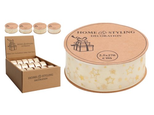 Stuha 2700x25mm potisk zlatý hvězda, houslový klíč s notami box mix, krémová, zlatá