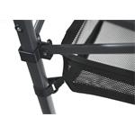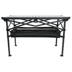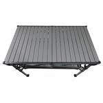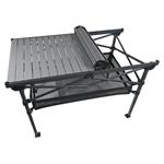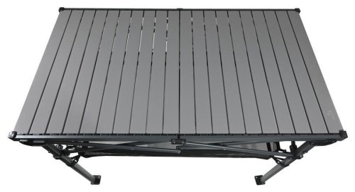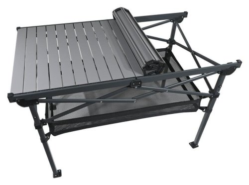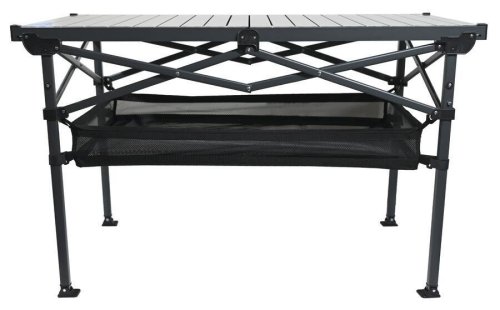 Robustní rám a nohy s možností uchycení k podkladu zajišťují stabilitu i na nerovném povrchu. Lamelová konstrukce desky umožňuje snadné složení i rozložení. Díky praktickému síťovanému odkládacímu prostoru budete mít drobnosti vždy po ruce. Po složení se stůl vejde pohodlně do auta nebo karavanu.