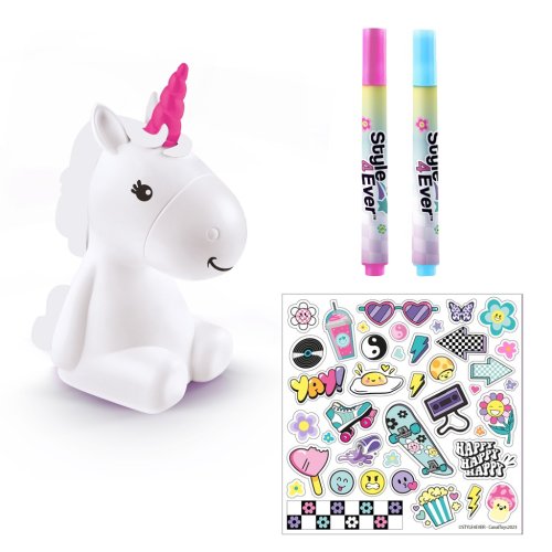 Přineste do svého pokoje magii se Svítícím Jednorožcem Style4Ever, kterého si děti samy ozdobí! Tato kreativní sada je ideální pro všechny malé umělce, kteří se rádi zapojují do tvoření a zároveň milují kouzelné dekorace. Svítící jednorožec, kterého si můžete ozdobit podle vlastních představ, přináší nejen zábavu, ale i krásné světlo, které vytvoří útulnou atmosféru. Balení obsahuje: svítící figurka jednorožce v krásném designu, který po dokončení projektu rozzáří váš pokoj. Svítí 8 barvami. Dále 4 fixy – pro malování a dozdobení jednorožce v různých barvách. Nálepky – pro ještě větší kreativní možnosti při dekorování. Návod na použití – snadný postup pro kreativní zábavu.<br> Vyžaduje 3× LR1130 1,5V baterie (jsou součástí balení).<br> Vhodné pro děti od 6 let.
