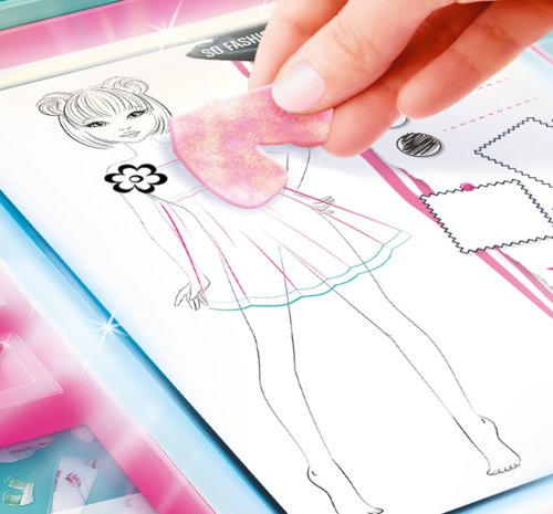 V balení naleznete: Návrhářské módní studio včetně podsvícené položky 20 modelů 1 oboustranný fix Sáček s 25 kamínky Lepidlo 4 barevné tužky 6 potištěných roliček 12 potištěných archů 3 samolepící archy látek 2 archy šablon 3 archy obkreslovacích šablon 2 archy nálepek