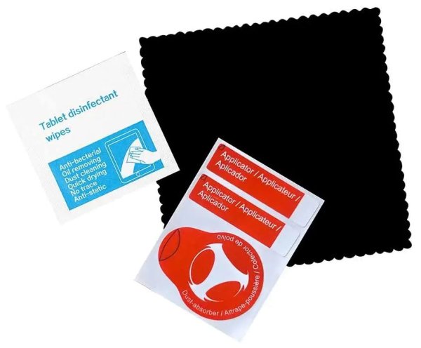 Obsah balení: ochranná fólie z tvrzeného skla, čisticí sada