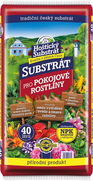 Hoštický substrát pro pokojové rostliny je vyroben ze směsi vytříděné světlé a tmavé rašeliny, prosetého jemně tříděného křemičitého písku, perlitu, přírodní jílovité složky a minerálního vícesložkového hnojiva s mikroprvky. Půdní reakce je upravena jemně mletým dolomitickým vápencem. Substrát je určen pro sázení a přesazování všech druhů pokojových rostlin. Má jemnou strukturu a díky perlitu i vysokou vzdušnost. Díky obsahu jílovité složky má vyšší poutavost vláhy i živin a zamezuje jejich vyplavování. Obsahuje potřebné množství základních i stopových živin na prvních cca 6 týdnů pěstování. Balení: 40 l.