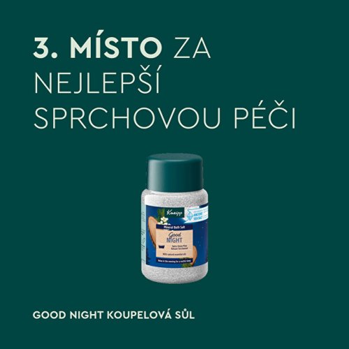 Relaxační koupel před spaním Sůl do koupelových solí Kneipp pochází z přírodního solné pánve v Luisenthallu. Během koupele dodá tělu přes pokožku celou řadu minerálů a stopových prvků. Díky obsahu přírodních olejů regeneruje a pečuje o vaši pokožku. Použité esenciální oleje ze švýcarské borovice a indického santalového dřeva jsou známé svými zklidňujícími účinky. Večerní koupel se solí Kneipp Good Night vám pomůže ke snadnějšímu usínání i kvalitnějšímu spánku. Tento produkt získal ocenění v Cosmopolitan Beauty Awards 2023 (3. místo v Péče o tělo – Popular nejlepší sprchová péče).