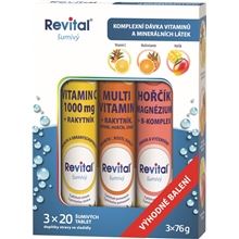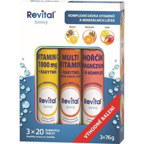 Balíček doplňků stravy Revital, šumivé tablety v praktickém a výhodném balení Balení obsahuje 3x 20 šumivých tablet: Revital Vitamin C 1 000 mg + rakytník, příchuť citron - doplněk stravy, tablety s …