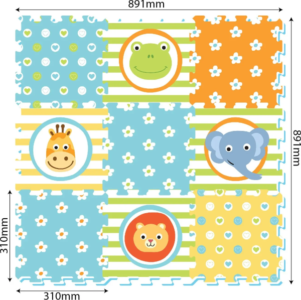Pěnové podlahové puzzle s potiskem zvířátek. Pěnový koberec je vhodný pro děti již od 10 měsíců. Je ideální k vytvoření hrací plochy nejen do dětských pokojíčků, ale všude tam, kde si hrají děti a plovoucí podlaha, dlažba nebo linoleum jsou příliš chladné. Pěnové podlahové puzzle je měkké, omyvatelné, zdravotně nezávadné, tlumí hluk a skvěle izoluje. Tloušťka dílků je 1 cm.