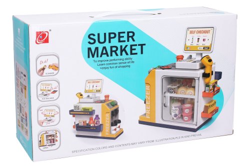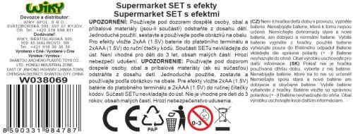 Supermarket set. Rozměry 20,5x37x41 cm. Světelné a zvukové efekty. 2xAA do platebního terminálu, 2xAAA do ruční čtečky nejsou součástí. Stolek s pokladnou, čtečka, platební karta, bankovky, mince, kávy, džusy, jogurty, mléko, sushi, cukrovinky a další.