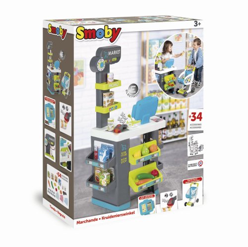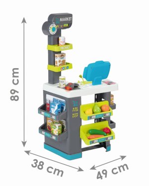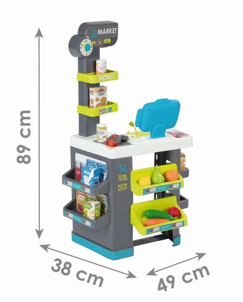 Smoby supermarket s elektronickou pokladnou s LCD displejem, s integrovanou kalkulačkou, se skenerem s funkcí zvukového signálu a světla, nastavitelnými hodinami a spoustou příslušenství. Včetně nákupního košíku, do jehož rukojeti lze vložit minci. Pokladník může použít mikrofon (bez funkce), bankovky a mince lze uložit do výklopné přihrádky na peníze. Děti se tak hravou formou učí, jak správně zacházet s penězi. Sortiment je pestrý a nabízí ovoce a zeleninu, sladkosti a makety obalů potravin. Veškeré zboží lze přehledně vystavit v regálech supermarketu. Rozměry (DxŠxV): 48,9 x 38,5 x 89,6 cm.