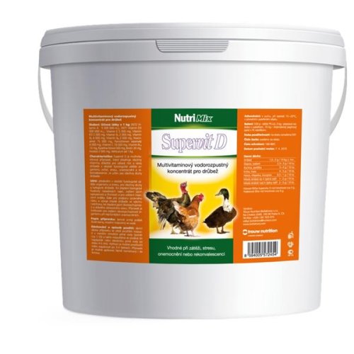 PROBLÉM Při zvýšené fyziologické zátěži, která může být vyvolána vysokou užitkovostí, stresem (transportní, nutriční, technologický), zhoršeným zdravotním stavem nebo stájovým prostředím dochází ke zvýšeným nárokům na metabolismus organismu. Vitaminy, které se významně podílí na biochemických reakcích v těle, umožňují zvířatům se s touto situací lépe vyrovnat a udržet užitkovost na požadované úrovni. ŘEŠENÍ Supervit D je vhodný v období fyziologické zátěže organismu nebo stresu, pro všechny druhy a kategorie drůbeže. Pro zvýšení líhnivosti a oplozenosti vajec, pro udržení intenzivní snášky, na podporu správného růstu a vývoje mláďat a ke zlepšení jejich životaschopnosti a obranyschopnosti.j.j., vitamin E 5 000 mg, vitamin K3 2000mg, vitamin B1 2 000 mg, vitamin B2 4 000 mg, vitamin B6 2 000 mg, vitamin B12 10 mg, vitamin C 10 000 mg, kyselina listová 500 mg, niacinamid 15 000 mg, pantothenan vápenatý 6 000 mg, biotin 30 mg, inositol 2 000 mg. ZPŮSOB APLIKACE Přípravek je určen k aplikaci do pitné vody, případně i k zamíchání přímo do krmiva. Nejprve se denní dávka rozpustí v menším množství vody v poměru cca 1 : 10 a dále se tento roztok přidává do napáječek nebo do zásobníku vody. Při podávání v krmivu je nutné dávku rovnoměrně zamíchat. Doba aplikace 4 – 5 dnů, aplikaci je možné prodloužit nebo po 3 – 4 týdnech zopakovat. DÁVKOVÁNÍ
