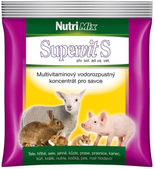 Dávkování: tele, hříbě - 5 - 10 g, tele, jehně, kůzle - 2 - 3 g, prase - 2 - 10 g, prasnice, kanec - 10 - 20 g, kůň - 30 - 40 g, králík, nutrie, kočka, pes - 0,5 - 1 g denně. Jakostní znaky: vitamín A 5000000 m.j./ kg, vitamín D3 50000 m.j./ kg, vitamín E (alfatokoferol) 10000 mg / kg, vitamín B1 2000 mg / kg, vitamín B2 4000 mg / kg, vitamín B6 2000 mg / kg, vitamín B12 10 mg / kg, niacin 15000 mg / kg, kyselina pantotenová 6000 mg / kg, vitamín C 10000 mg / kg, kyselina listová 500 mg / kg, biotin 30 mg / kg.