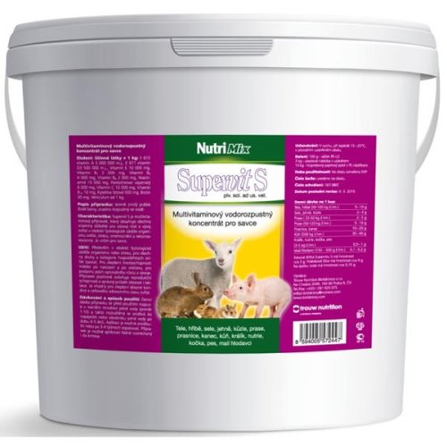 PROBLÉM Při zvýšené fyziologické zátěži, která může být vyvolána vysokou užitkovostí, stresem (transportní, nutriční, odstavový), zhoršeným zdravotním stavem nebo stájovým prostředím dochází ke zvýšeným nárokům na metabolismus organismu. Vitaminy, které se významně podílí na biochemických reakcích v těle, umožňují zvířatům se s touto situací lépe vyrovnat a udržet užitkovost na požadované úrovni. ŘEŠENÍ Supervit S je vhodný pro všechny druhy a kategorie hospodářských zvířat v období fyziologické zátěže organismu nebo stresu. Podává se pro zlepšení životaschopnosti mláďat po narození a po odstavu, na podporu jejich optimálního růstu a vývoje. SLOŽENÍ v 1 kg: vitamin A 5 000 000 m.j., vitamin D3 500 000 m.j., vitamin E 10 000 mg, vitamin B1 2 000 mg, vitamin B2 4000 mg, vitamin B6 2 000 mg, vitamin B12 10 mg, vitamin C 10 000 mg, niacinamid 15000 mg, pantothenan vápenatý 6 000 mg, kyselina listová 500 mg, biotin 30 mg. ZPŮSOB APLIKACE Přípravek je určen k aplikaci do pitné vody, případně i k zamíchání přímo do krmiva. Nejprve se denní dávka rozpustí v menším množství vody v poměru cca 1 : 10 a dále se tento roztok přidává do napáječek nebo do zásobníku vody. Při podávání v krmivu je nutné dávku rovnoměrně zamíchat. Doba aplikace 4 – 5 dnů, aplikaci je možné prodloužit nebo po 3 – 4 týdnech zopakovat. DÁVKOVÁNÍ