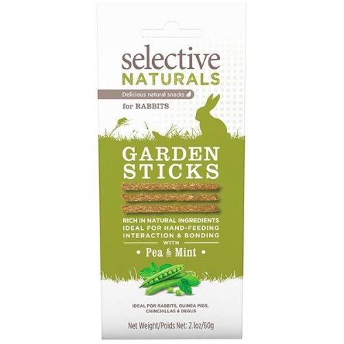 Zdravé přírodní pamlsky Selective Naturals ve tvaru tyčinek pro králíky, morčata a další býložravé drobné savce. Ideální pro podávání z ruky, které sbližuje a pomáhá vytváření bližšího vztahu se zvířetem. Tyčinky Garden Sticks s hráškem a mátou. Upečené z přírodních surovin v pekárně Supreme v srdci Suffolku. plné přírodních surovin vysoký obsah vlákniny 25% a nízký obsah tuků bez přidaného cukru bez umělých barviv Analytické složky: Hrubá bílkovina 8 %, hrubý tuk 2,5 %, hrubá vláknina 25,5 %, vlhkost 11 %. Složení: Mleté seno z bojínku lučního, mleté vojtěškové seno, ovesná mouka, mleté lusky rohovníku, hrášek (10 %), lněné semínko, sójový olej, sušené listy máty peprné (0,5 %), mátový olej (0,2 %).