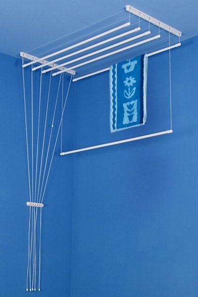 Stropní sušák na prádlo Ideal můžete umístit do koupelny s maximálním využitím prostoru. Prádlo zavěšené na stropní sušák nezavazí a rychleji schne díky přirozenému proudéní teplého vzduchu. Stropní sušák na prádlo Ideal lze použit v koupelně, na verandě nebo na balkóně. Každá z tyčí se ovládá samostatně. Sada je dodávána včetně kotvícího materiálu. Sušák je možné upevnit i na protilehlé stěny. Maximální zatížení jedné tyče cca 3 kg. Délka stropní lišty 45 cm, délka tyče 190 cm, která je kovová s plastovou povrchovou úpravou. EAN 8001244013346