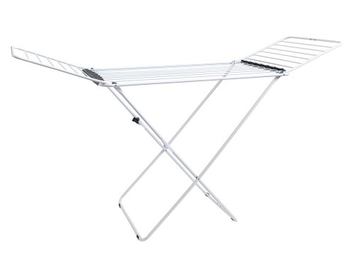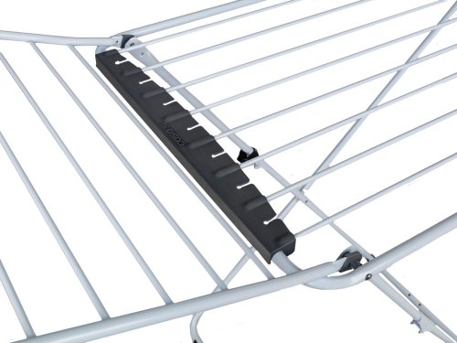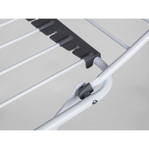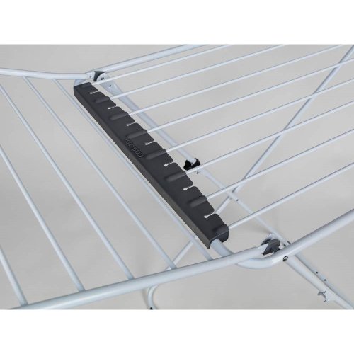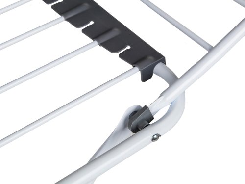 Stabilní přenosný sušák na prádlo nabízí cca 20 metrů sušící plochy, což představuje až dvě plné pračky prádla. Boční křídla jsou vhodná na sušení delšího prádla. Praktickým pomocníkem je držák na sušení ponožek. Velkou výhodou je stabilní konstrukce z bílých trubek, doplněných plastovými držáky v šedé barvě. Bezpečnému použití napomáhá také dětský bezpečnostní zámek, omezující možnost nechtěného složení a případného pádu.