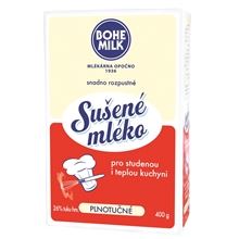 Sušené mléko Bohemilk, snadno rozpustné, k použití všude tam, kde je zapotřebí mléka - k přípravě kávy, kakaa, polévek, omáček, těsta, kaší, pudinků apod.