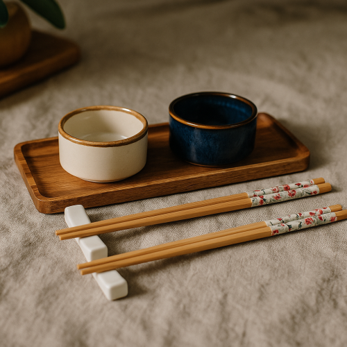 Stylová sada na servírování suši kombinuje přírodní materiály a elegantní design. Obsahuje servírovací tác z akáciového dřeva, porcelánové misky a držák na hůlky doplněný bambusovými hůlkami. Ideální pro milovníky asijské kuchyně i jako originální dárek.