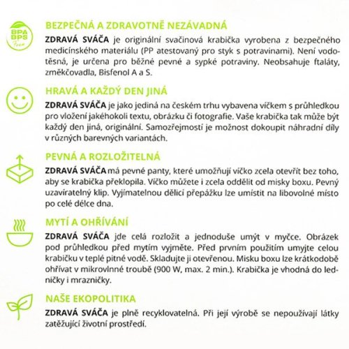 Svačinový box ZDRAVÁ SVÁČA - Unikátní český výrobek od výrobce Zdravé lahve, který je vyroben z polypropylenu určeného pro lékařské a farmaceutické použití a zabraňuje šíření plísní a zápachu.