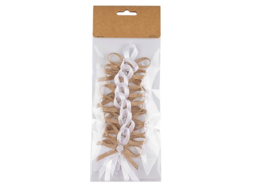 Svatební jutové mašličky v boho stylu jsou velice populární. Slouží především k ozdobení klopy ženicha a svatebčanů. Jsou kvalitní, ručně zpracované. Skládají se z jutové mašle, saténové stuhy, [drobné aplikace] s perlovým leskem a špendlíku. Mašličky můžete použít také k aranžování různých svatebních dekorací. Mašličky jsou zabalené po 10 ks v sáčku s papírovou kartou na zavěšení na prodejní stojan. [Varianta č. 1 je s růžičkou. Varianta č. 2 je se srdíčkem.]