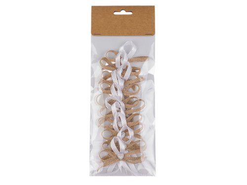 Svatební jutové mašličky v boho stylu jsou velice populární. Slouží především k ozdobení klopy ženicha a svatebčanů. Jsou kvalitní, ručně zpracované. Skládají se z jutové mašle, saténové stuhy, [drobné aplikace] s perlovým leskem a špendlíku. Mašličky můžete použít také k aranžování různých svatebních dekorací. Mašličky jsou zabalené po 10 ks v sáčku s papírovou kartou na zavěšení na prodejní stojan. [Varianta č. 1 je s růžičkou. Varianta č. 2 je se srdíčkem.]