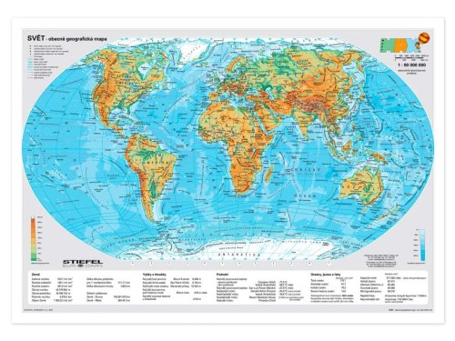 Mapa, která je nedílnou součástí hodin zeměpisu, obsahuje na dvou stranách dvě základní mapy světa: obecně zeměpisnou a politickou. Obecně zeměpisná mapa je určena nejen na první hodiny zeměpisu, kdy se žáci učí určovat zeměpisnou polohu, zeměpisnou šířku a délku, vyhledat na mapě rovník, obratníky, polární kružnice, seznamují se se znázorňováním výškopisu a polohopisu, ale je také určena k výuce a upevňování vědomostí ze zeměpisu světadílů a oceánů. Ve vyšších ročnících ZŠ je využívána především politická mapa dnešního světa. Tato oboustranná mapa je zároveň výborným doplňkem učiva na všech typech středních škol. Rozměr: A3