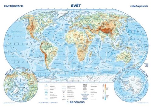 Oboustranná mapa světa vám poskytne základní přehled o jeho politickém i fyzickém uspořádání. Fyzická mapa obsahuje všechna hlavní světová pohoří i s jejich nejvyššími vrcholy, nejdelší a nejvýznamnější řeky, největší jezera, ale také další významné přírodní tvary a oblasti: pouště, ostrovy a poloostrovy, nížiny, prolákliny nebo oceány a moře, včetně zálivů, průlivů a podmořských tvarů. V politické mapě naleznete všechny státy, včetně jejich hlavních měst, ale také závislá a sporná území. Evropa a oblast Karibského moře jsou zpracovány ve větších měřítcích, pro jejich lepší přehlednost. * oboustranná laminovaná mapa * přehledná mapa světového horopisu a vodopisu * fyzické výřezy Arktidy a Antarktidy * politické uspořádání světa se všemi státy a jejich hlavními městy * podrobné výřezy Evropy a Karibiku